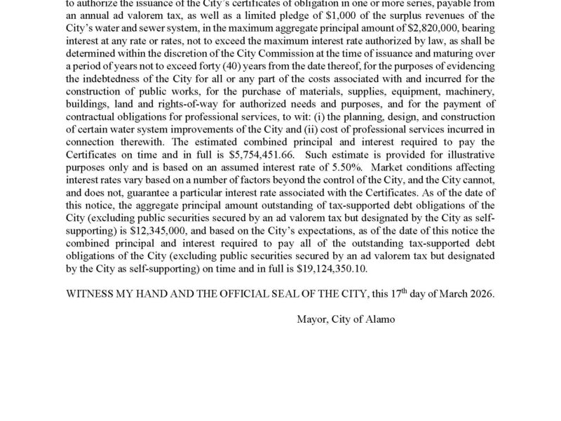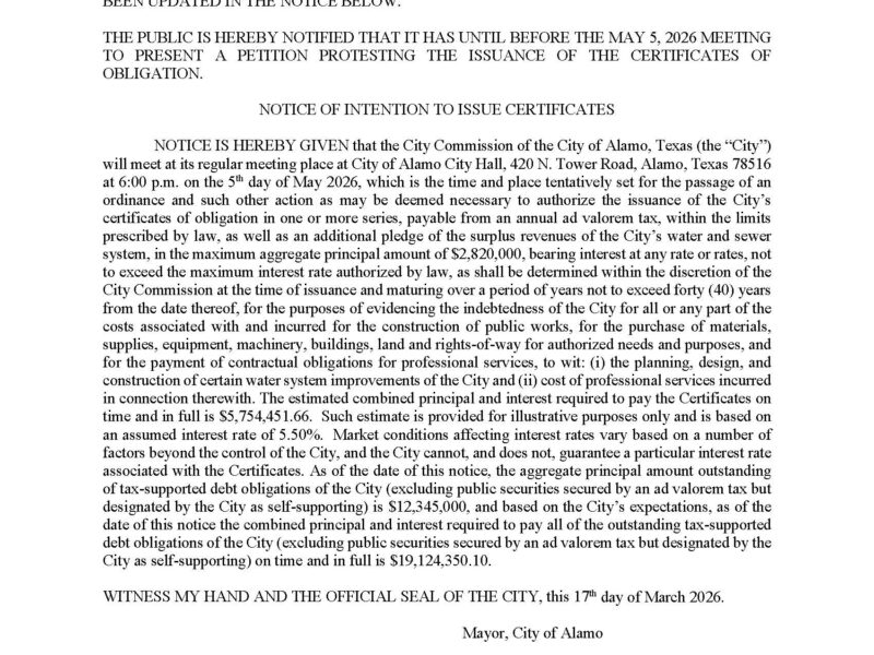 NOTICE REGARDING MEETING TO CONSIDER ISSUANCE OF THE CITY OF ALAMO, TEXAS CERTIFICATES OF OBLIGATION
