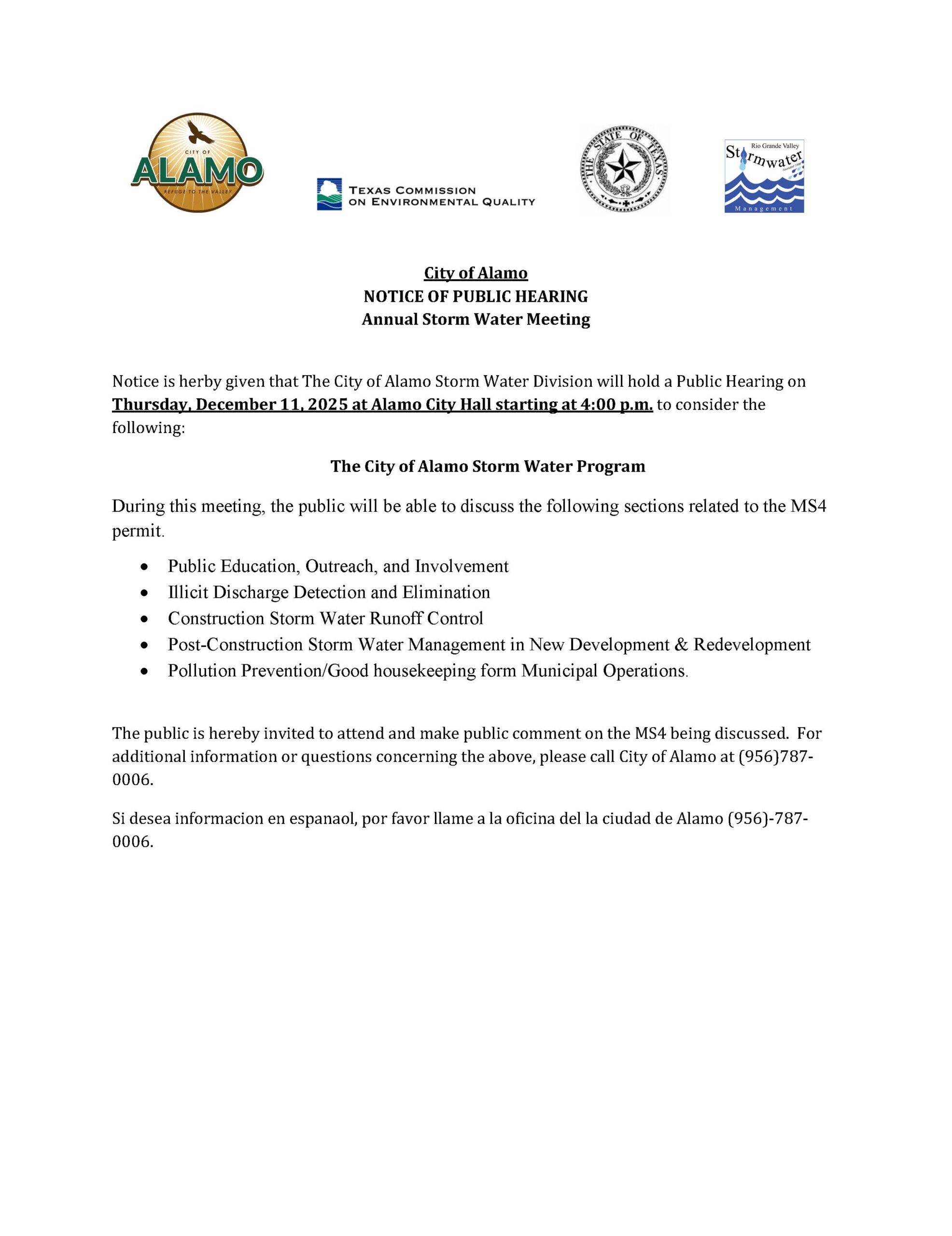 Notice is herby given that The City of Alamo Storm Water Division will hold a Public Hearing on Thursday, December 11, 2025 at Alamo City...