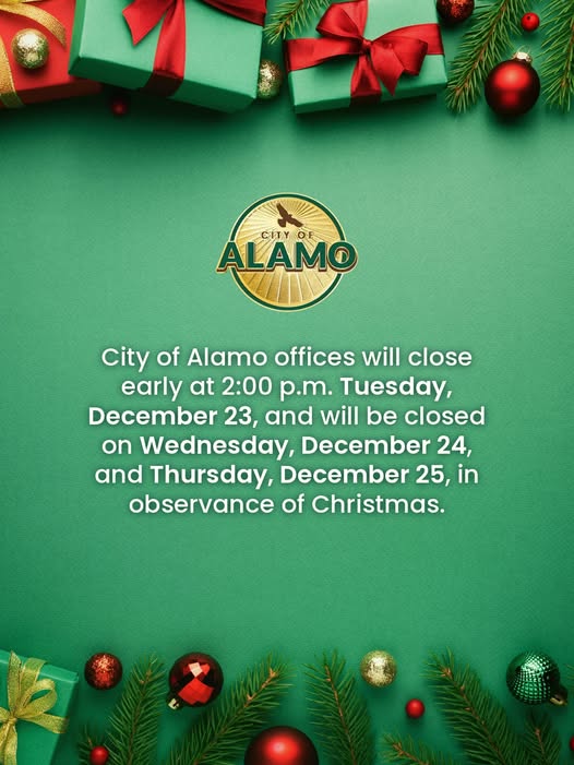All City of Alamo offices will have early release on Tuesday December 23 at 2:00 PM, close on Wednesday, December 24, and will remain closed...