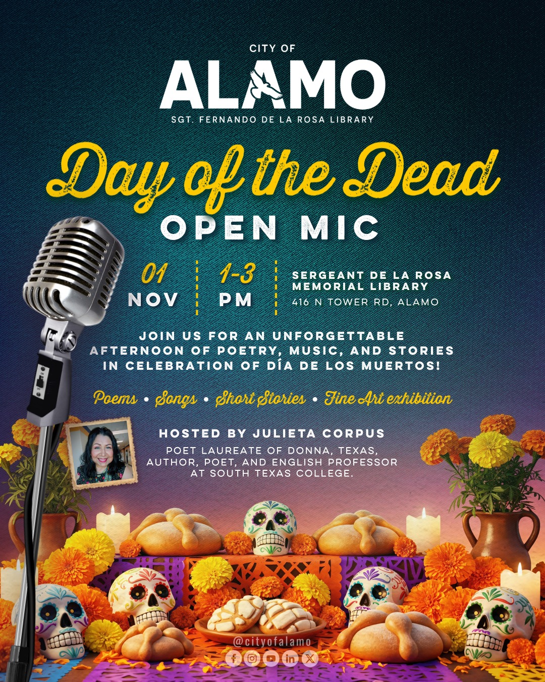 Dia de los Muertos open Mic Happening Saturday November 1st 1PM -3PM. Join Donna Poet Laureate Julieta Corpus and Artist Alma Quintanilla Castillo for an afternoon... |