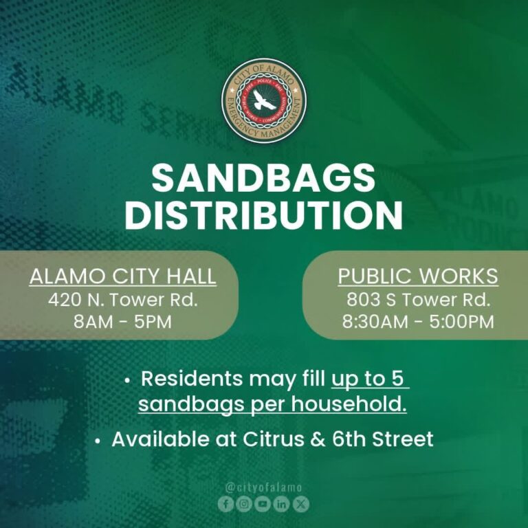 The City of Alamo offers self-serve sandbag locations for residents and businesses within city limits who would like to take proactive steps to protect their property.