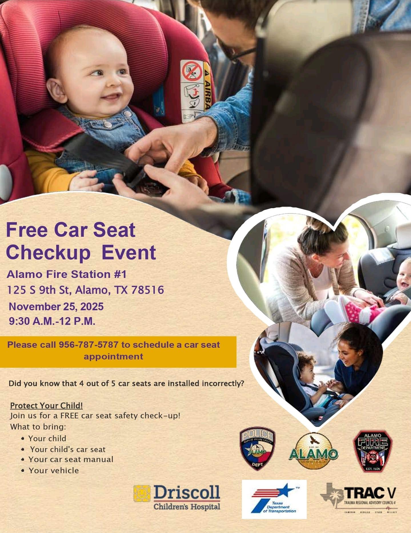 The Office of Emergency Management, in partnership with Driscoll Children’s Hospital, TxDOT, TRAC V, Alamo Fire Department and Alamo Police Department invites you to a Free Car Seat Checkup Event! 💛