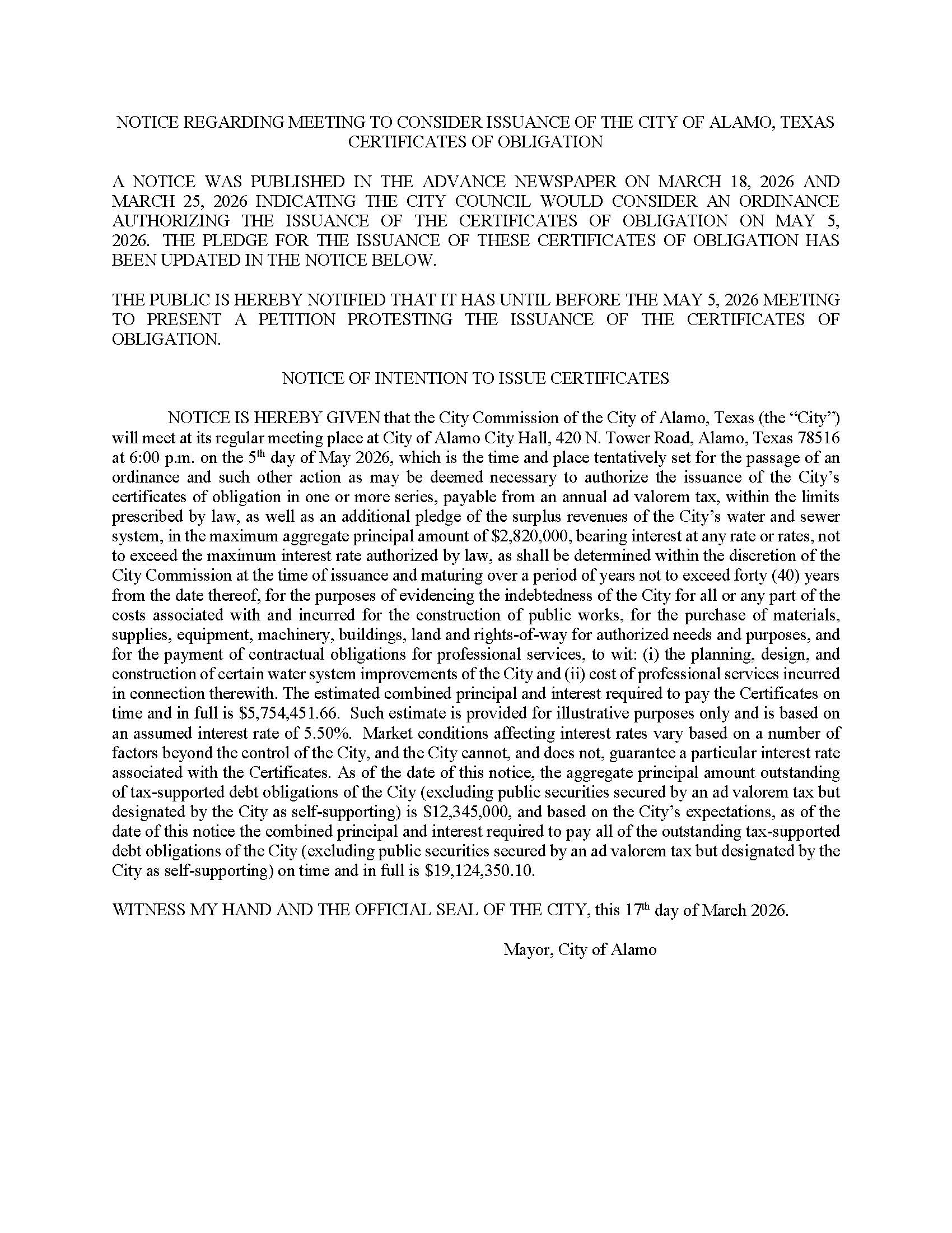 14 Apr NOTICE REGARDING MEETING TO CONSIDER ISSUANCE OF THE CITY OF ALAMO, TEXAS CERTIFICATES OF OBLIGATION Posted at 12:07h in News by alamoadmin 0 Comments