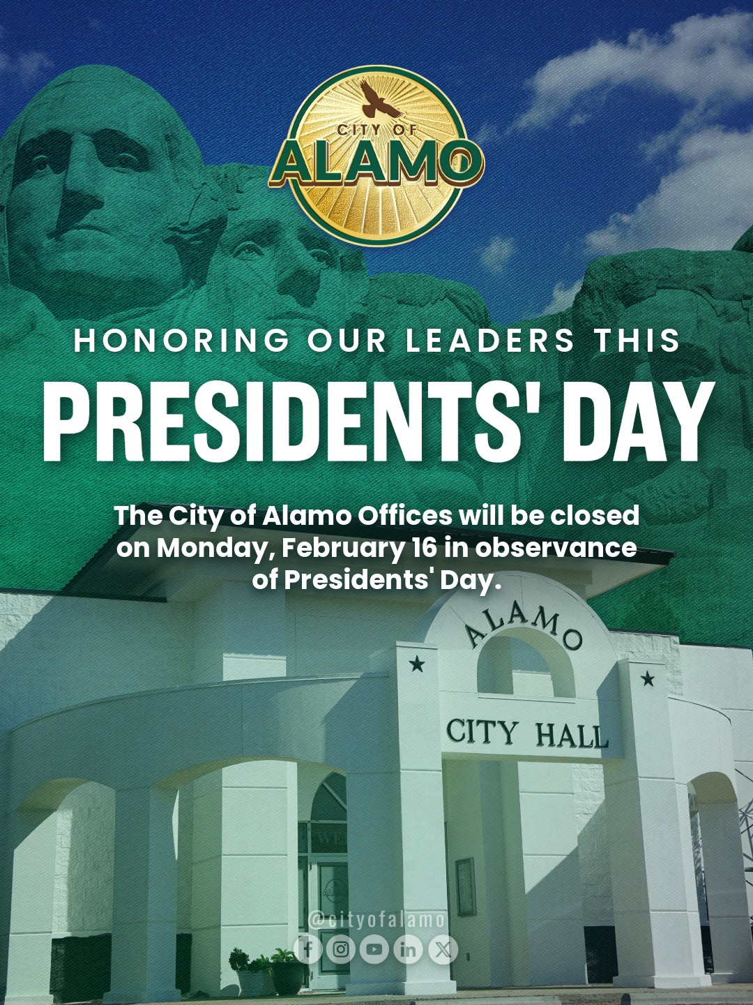 City of Alamo offices will be closed on Monday, February 16, in observance of Presidents Day. Regular business hours will resume the following business day.